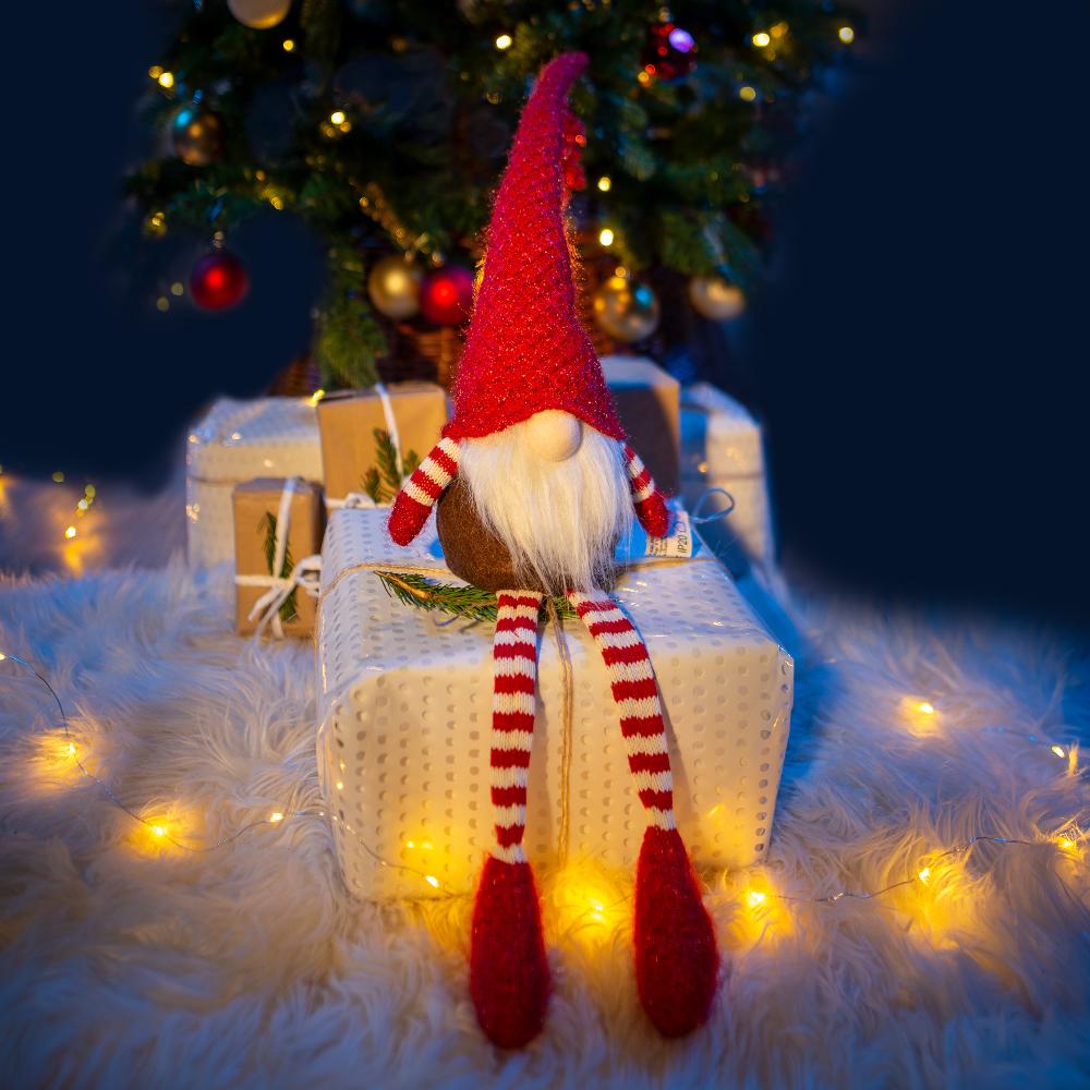 Karácsonyi manó / 6 LED / meleg fehér színárnyalat / Piros szín / 68 cm magasság / Alkalmas beltéri használatra / 2x CR2032 alkáli elemmel működtethető