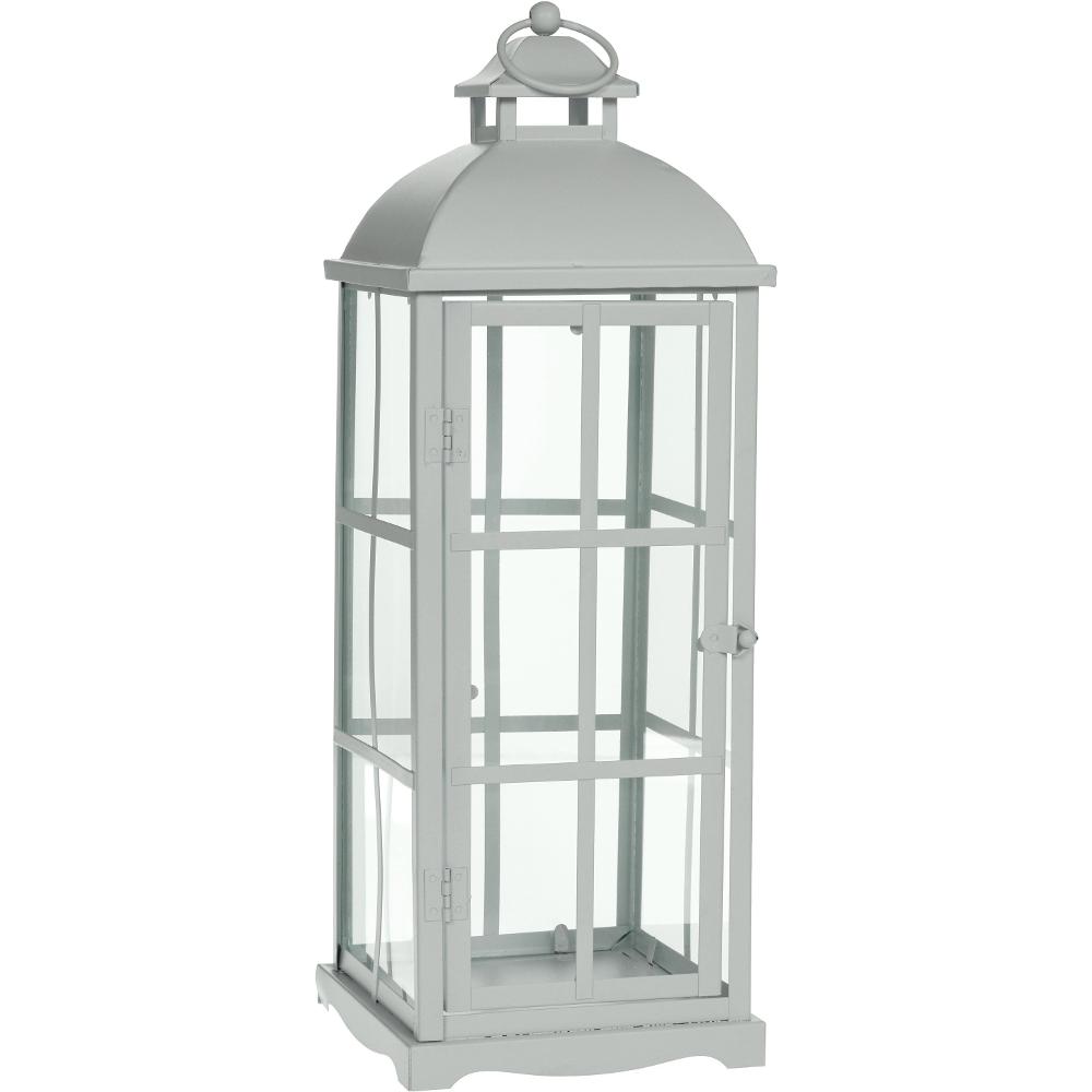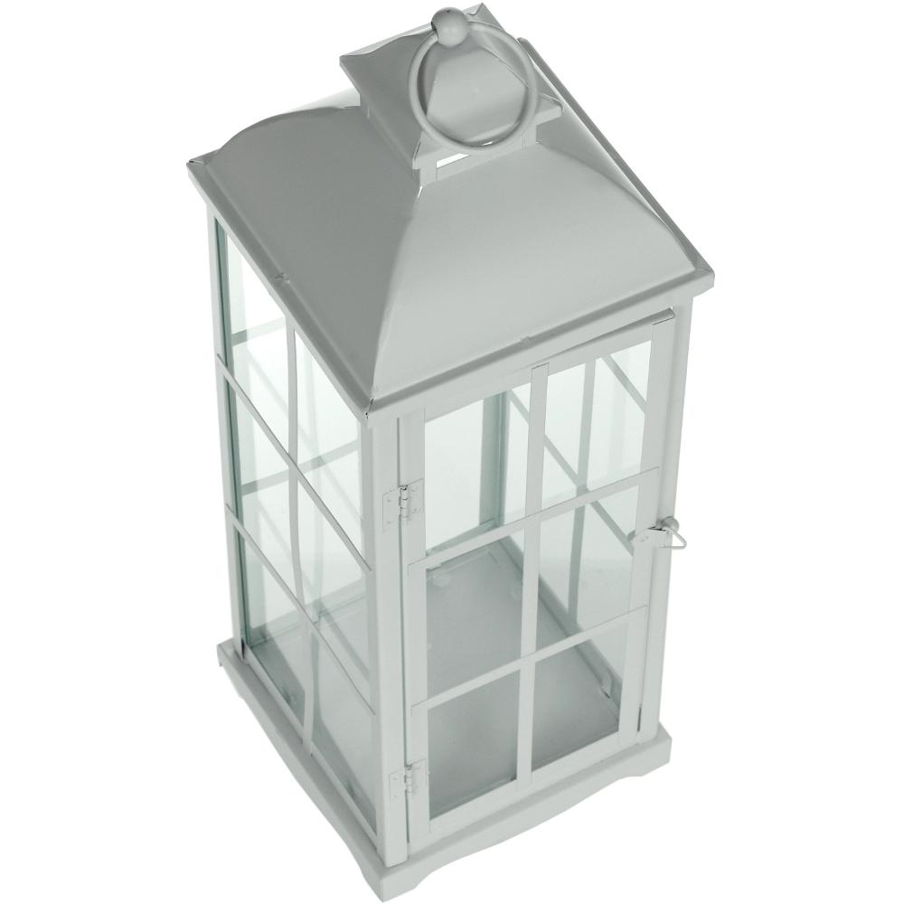Az üvegablakokkal ellátott fém fehér lámpa klasszikus és LED gyertyákhoz is használható. Méret 12,5 x 12,5 x 36,5 cm. Beltéri és kültéri használatra.