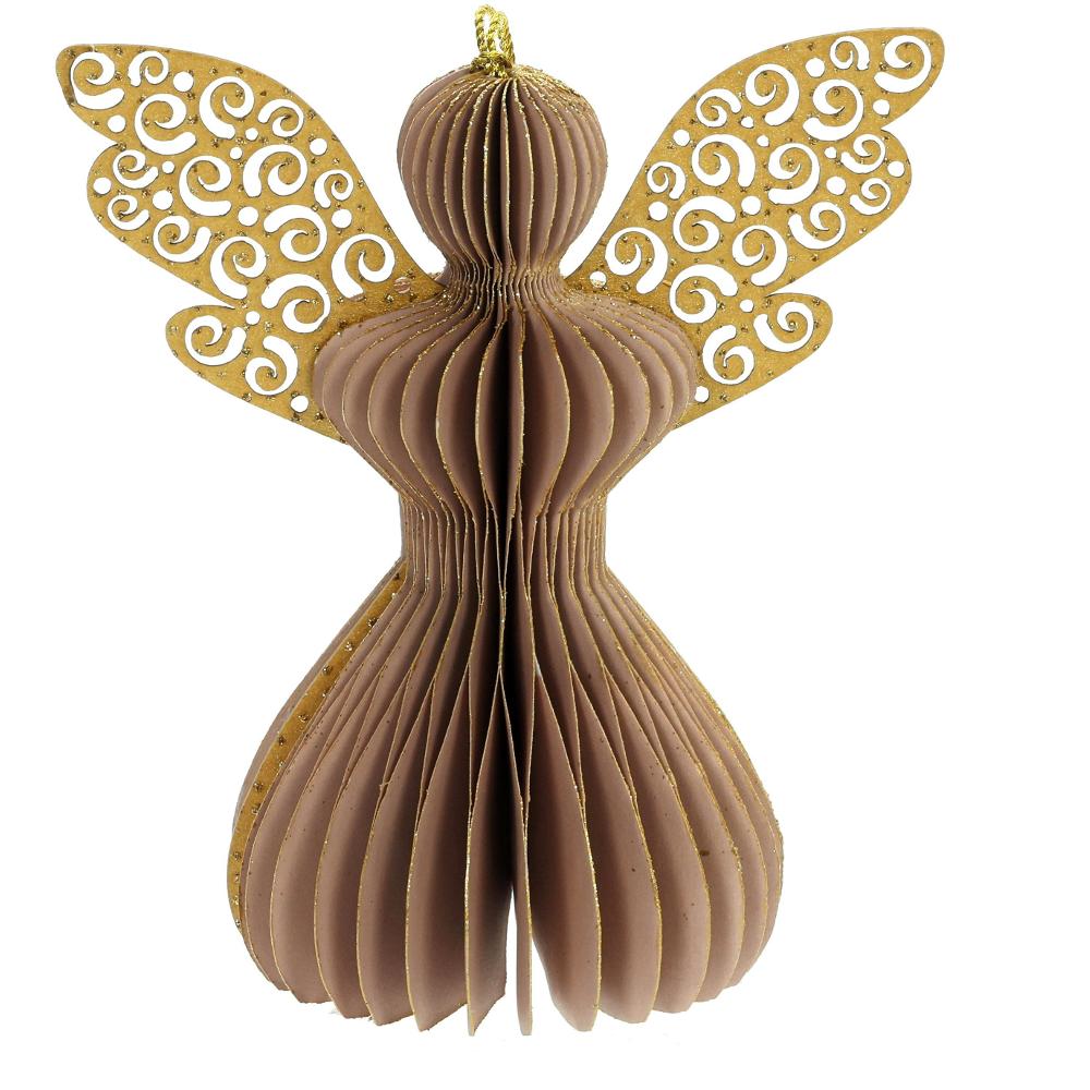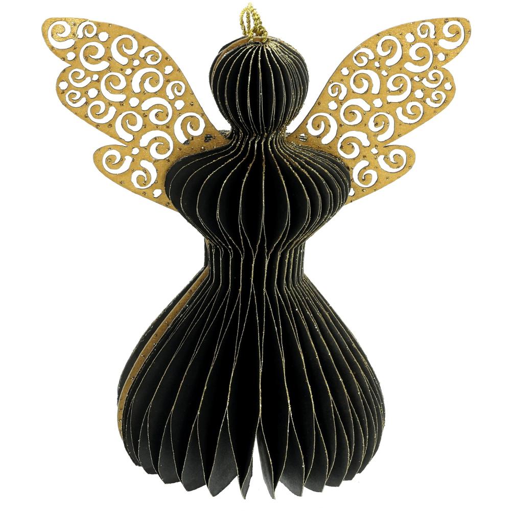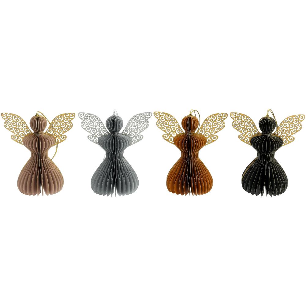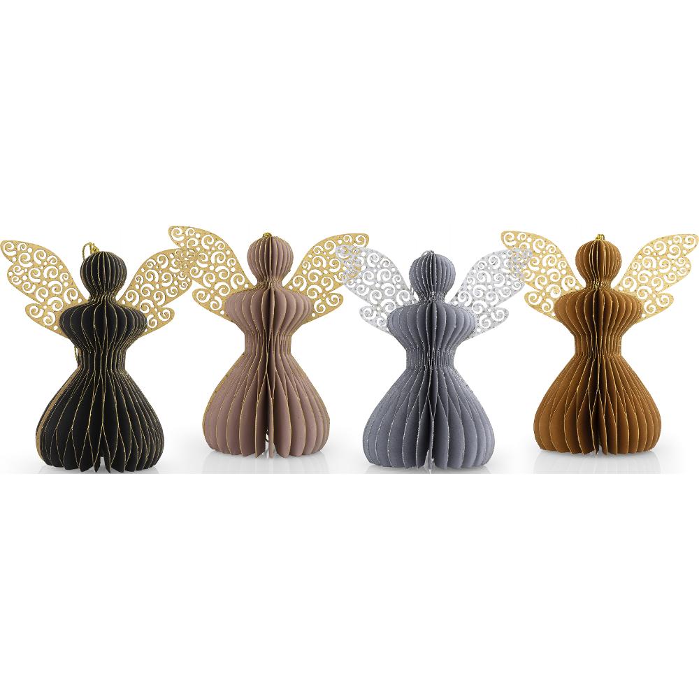 4 gyönyörű papírdísz angyal alakjában. A hajtogatott díszek méhsejt alakúak, arany csillogással a széleken. A készlet négy színű dekorációt tartalmaz: fekete, rózsaarany, mustár és ezüst. Csak beltérben használja.