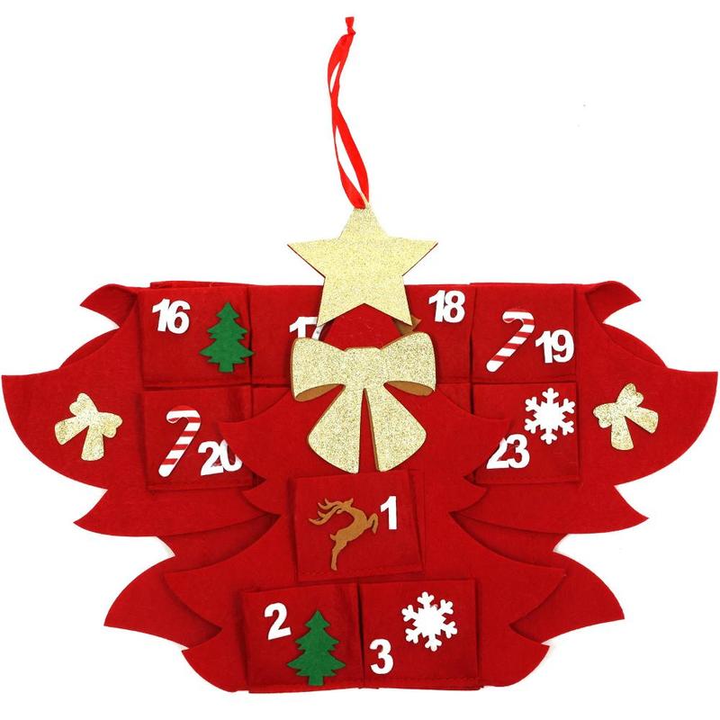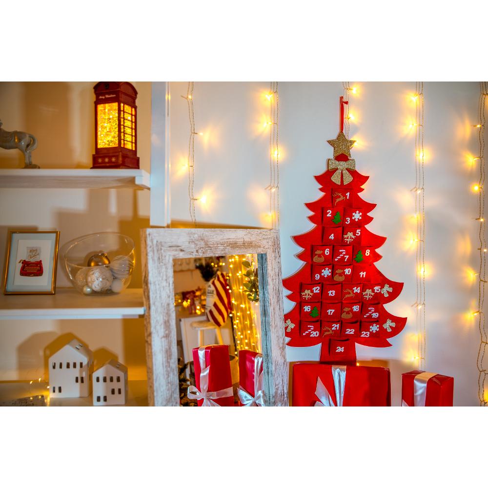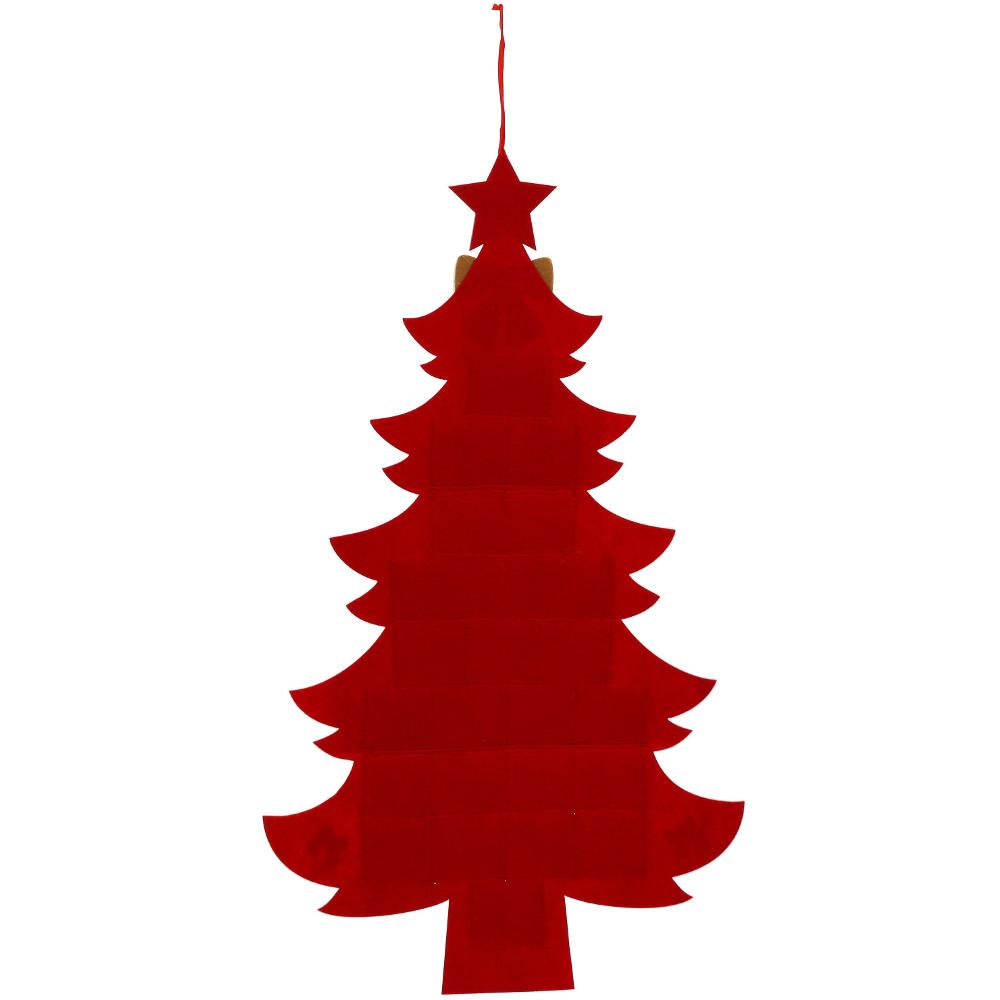 Karácsonyi adventi naptár / Fenyőfa design / Erős filc anyagból / Piros szín / 24 zseb / 51,5 x 90 cm méret