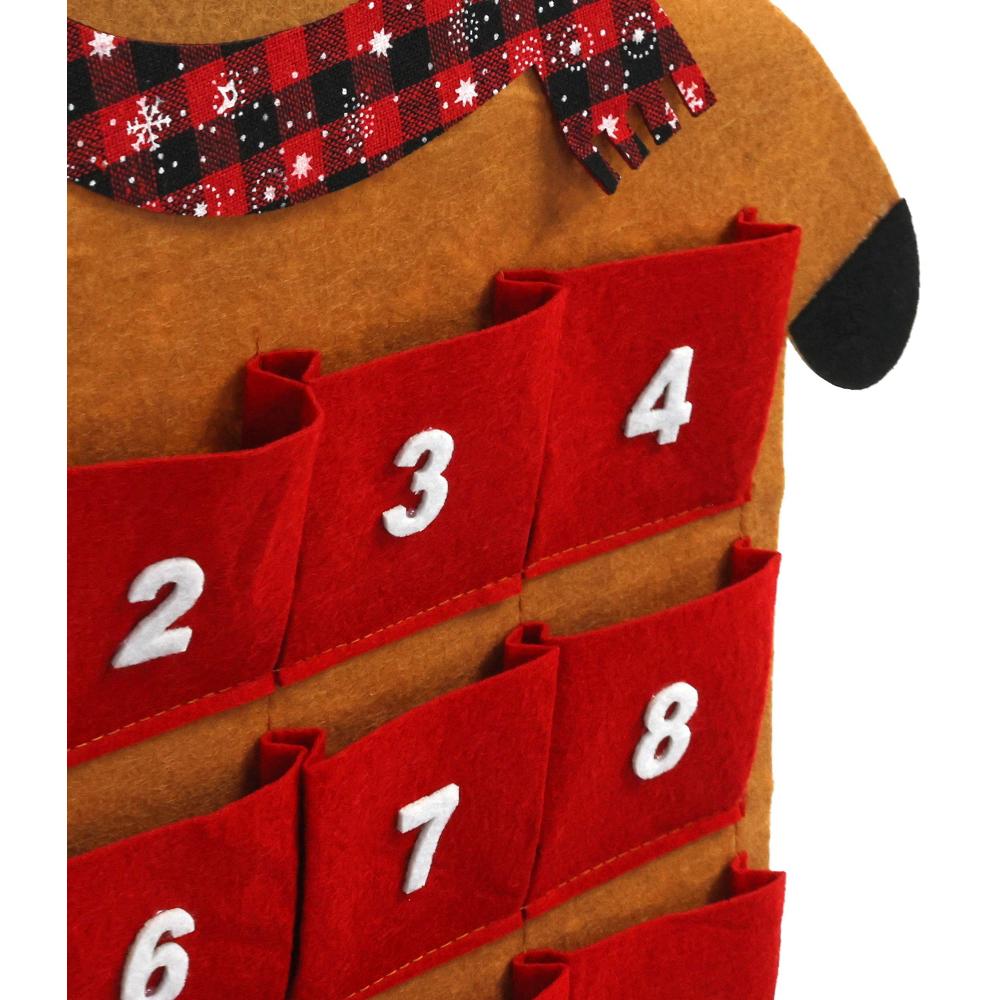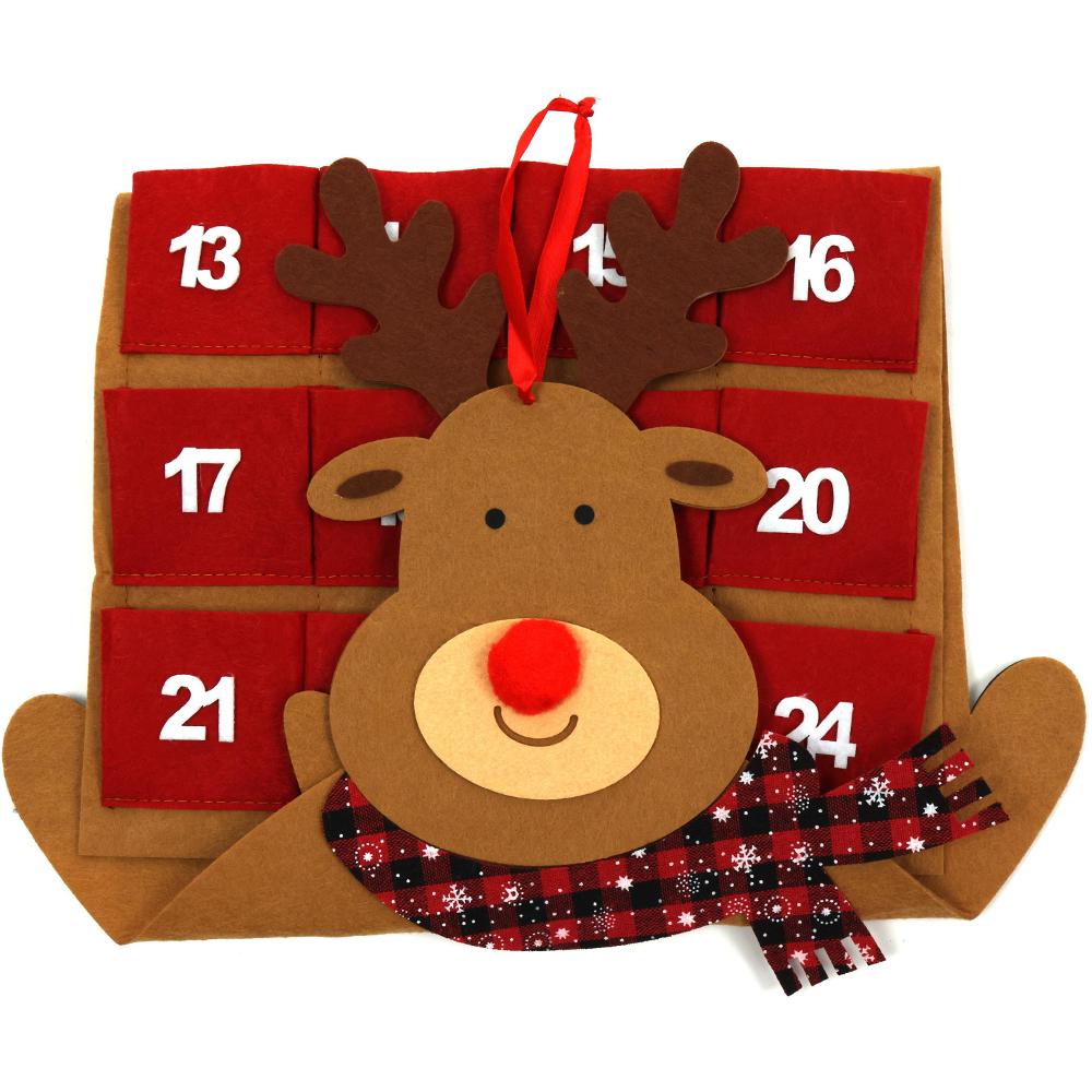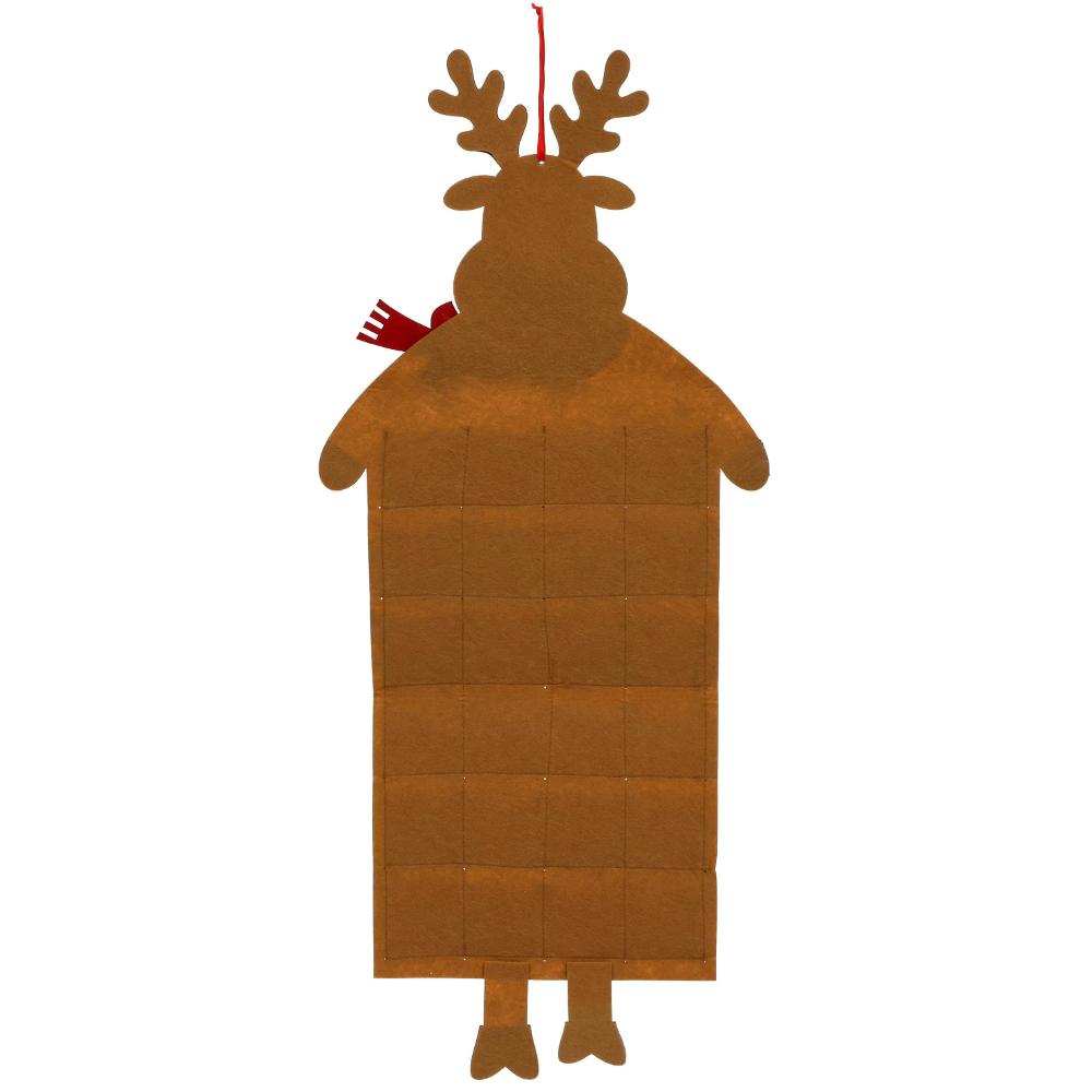 Karácsonyi adventi naptár / Rénszarvas design / Erős filc anyagból / Piros szín / 24 zseb / 30 x 90 cm méret